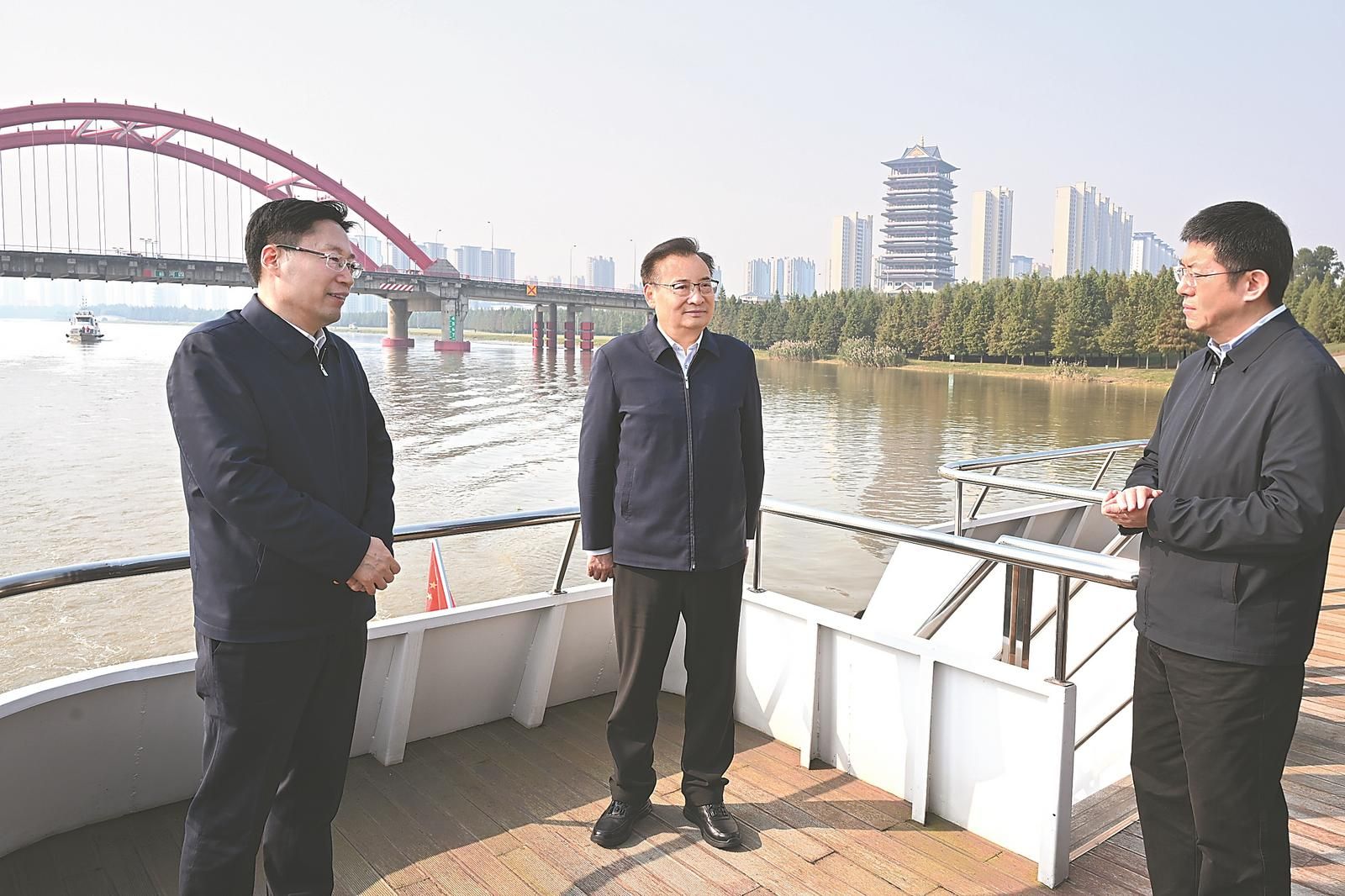 十一月十三日,省委书记梁言顺在颍河乘船察看河流水质和岸线环境,了解淮河干支流治理等情况。 杨竹 许昊 摄